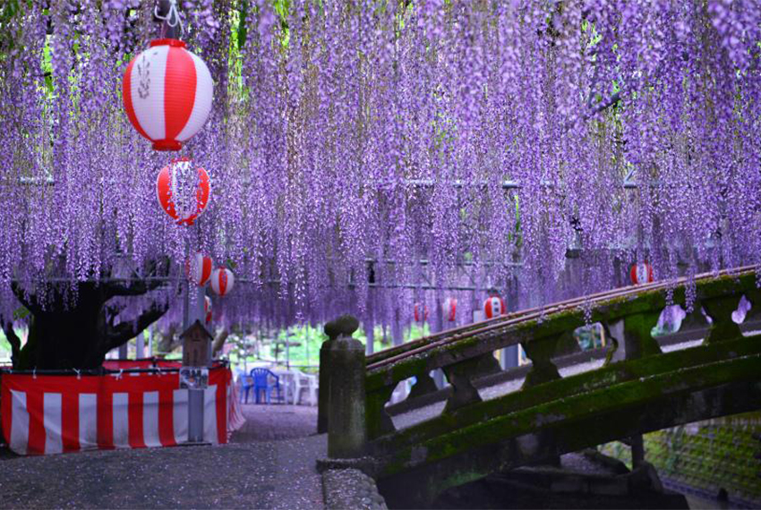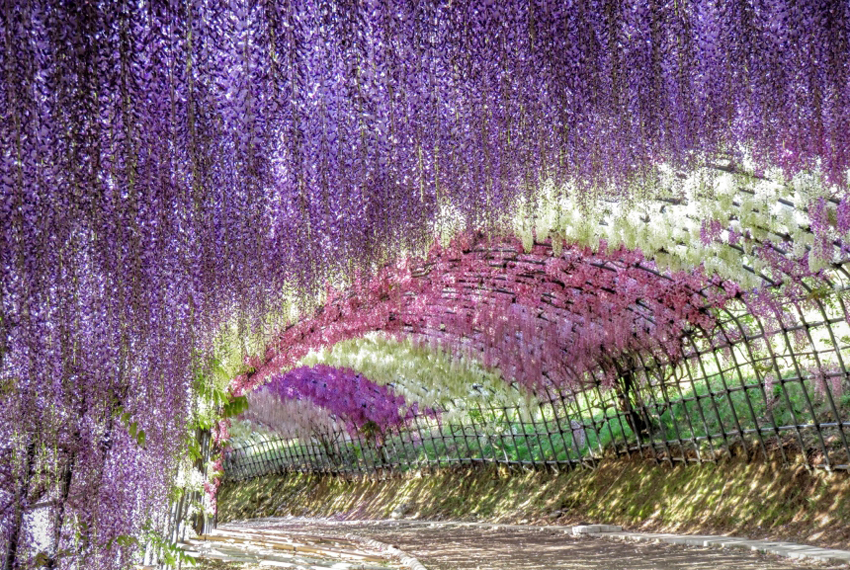 【河內藤園】(紫藤預估時間4月中旬~5月上旬) 是一座以藤花為主題的花園,被美國CNN選為「日本最美場所31選」。每年春季,園內約有22種不同品種的藤花競相綻放,其中最吸引人的景觀是兩條長達約80公尺與110公尺的紫藤隧道,花色從淡紫至白色、粉色等層次變化,伴隨輕柔香氣漫步其中,頭頂與左右被瀑布般垂落的花串包圍,景象浪漫又夢幻。