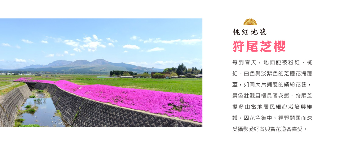 【狩尾芝櫻】(芝櫻預估時間4月中旬~5月上旬)每到春天,地面便被粉紅、桃紅、白色與淡紫色的芝櫻花海覆蓋,如同大片鋪展的繽紛花毯,景色壯觀且極具層次感。狩尾芝櫻多由當地居民細心栽培與維護,雖然園區規模不大,卻因花色集中、視野開闊而深受攝影愛好者與賞花遊客喜愛。