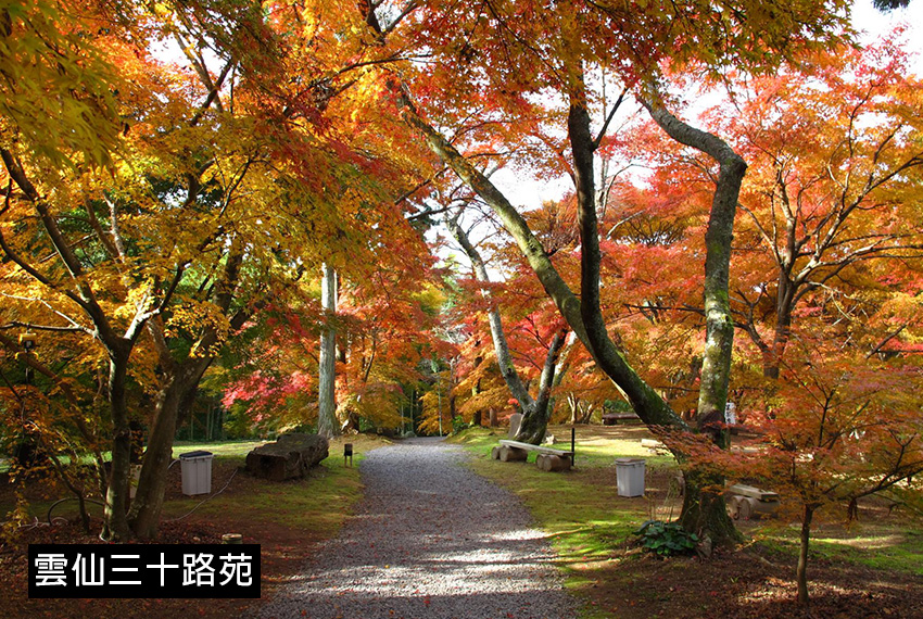 【雲仙三十路苑】雲仙的紅葉植物多達120種以上,被指定為國家天然植物。每年10月下旬開始就可以欣賞到雲仙的大自然的絢麗色彩。三十路苑也是「六兵衛茶屋」的經營者,從30多年前就開始在約25,000平方公尺的自家後山種植紅葉植物,如今已是漫山紅葉。夜晚園區內還有燈光秀,為您展現與眾不同的夢幻般的世界。