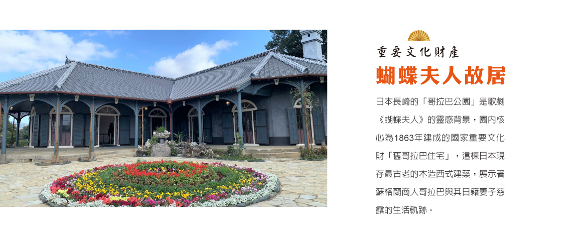 【蝴蝶夫人故居】日本長崎的「哥拉巴公園」是歌劇《蝴蝶夫人》的靈感背景,園內核心為1863年建成的國家重要文化財「舊哥拉巴住宅」,這棟日本現存最古老的木造西式建築,展示著蘇格蘭商人哥拉巴與其日籍妻子慈露的生活軌跡。該處可俯瞰長崎港、以心形石頭戀愛傳說聞名。