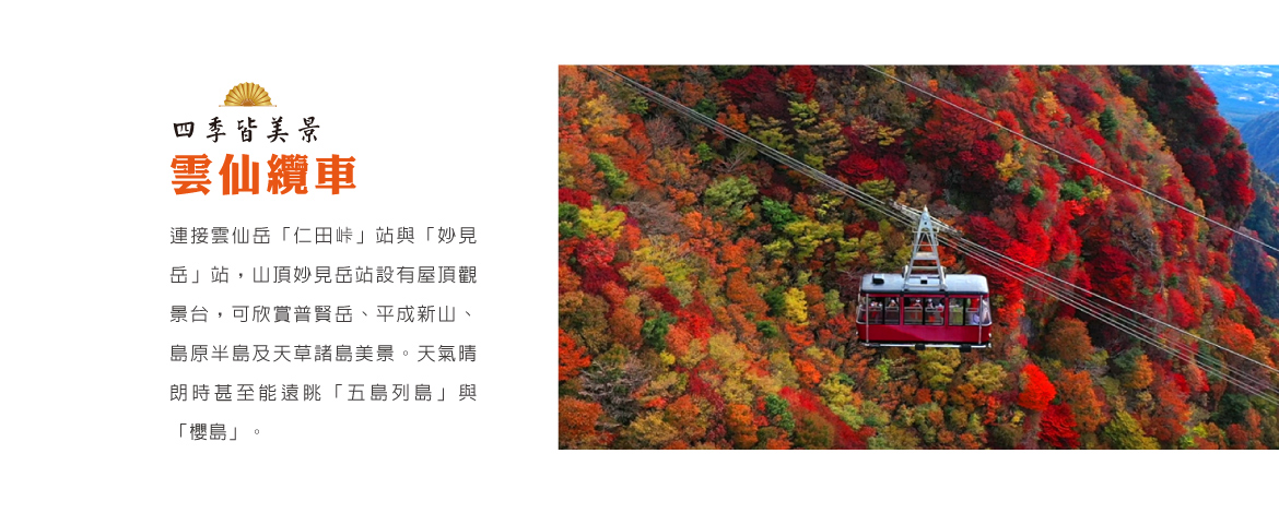 【雲仙公園 纜車】連接雲仙岳「仁田峠」站與「妙見岳」站,全長約500公尺的纜車。海拔高低差約174公尺。山頂妙見岳站設有屋頂觀景台,可欣賞普賢岳、平成新山、島原半島及天草諸島美景。天氣晴朗時甚至能遠眺「五島列島」與「櫻島」。春天山坡上有九州杜鵑,初夏有四照花,秋天紅葉,冬季霧冰,四季各異的自然美景迎接訪客。