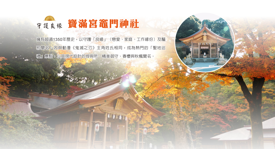 【寶滿宮竈門神社】位於福岡縣太宰府市寶滿山麓,擁有超過1350年歷史,以守護「良緣」(戀愛、家庭、工作緣份)及驅邪聞名。因與動漫《鬼滅之刃》主角姓氏相同,成為熱門的「聖地巡禮」景點,且以其現代設計的授與所、精美御守、春櫻與秋楓聞名。