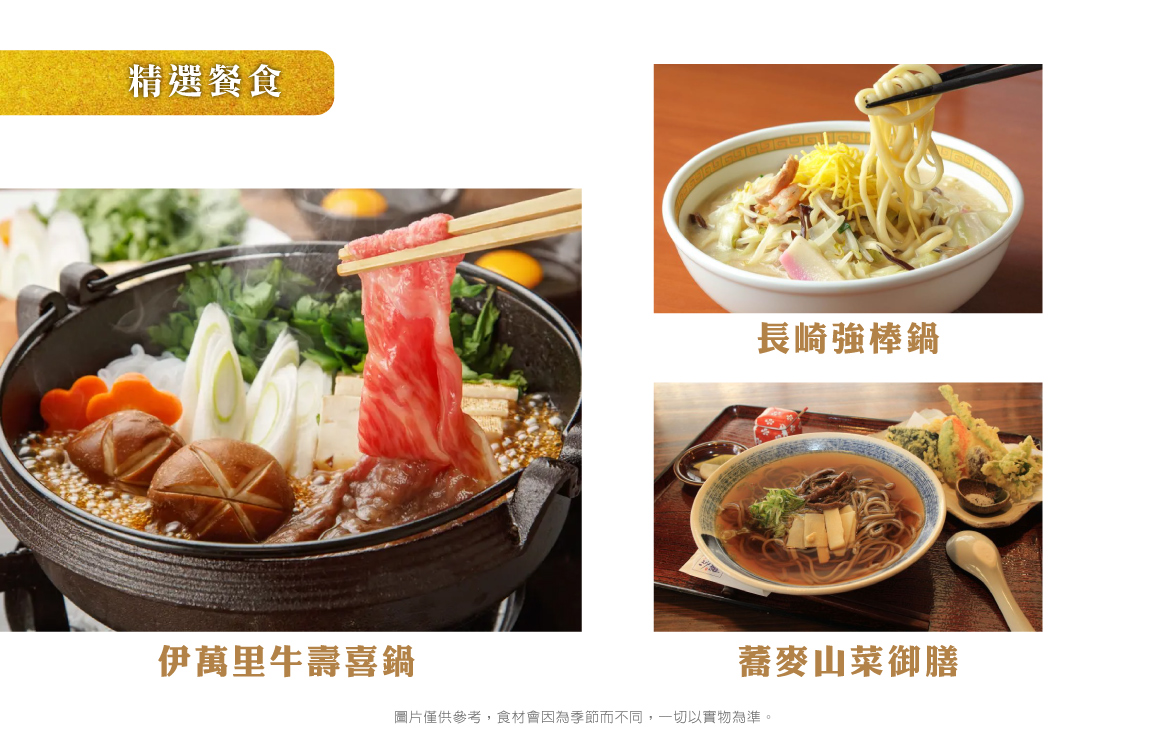 ※素食旅客請注意:由於疫情後日本餐廳人力短缺,廚師主要工作為提供餐廳常規餐食,對於素食恐無法精心料理,故須以餐廳所提供之內容為主,餐廳不接受現場指定或增加菜餚(例如炒一盤青菜等),如擔心料理不合口味,敬請旅客自備罐頭素食備用,敬請理解配合,謝謝。