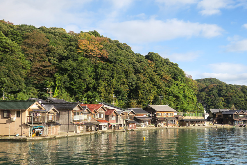 【伊根灣遊船】(紅葉預估時間11月上旬~11月下旬)作為日本國內最接近海洋的小鎮,大量保留了名為「船屋」的獨特建築物。所謂的船屋,是一樓臨海為船停靠的地方,二樓為居住空間的特殊建築,這種船屋在伊根灣周圍蓋了200餘棟,這些船屋被譽為「日本最美村落」之一,為日本重要的建造物群保存地區。